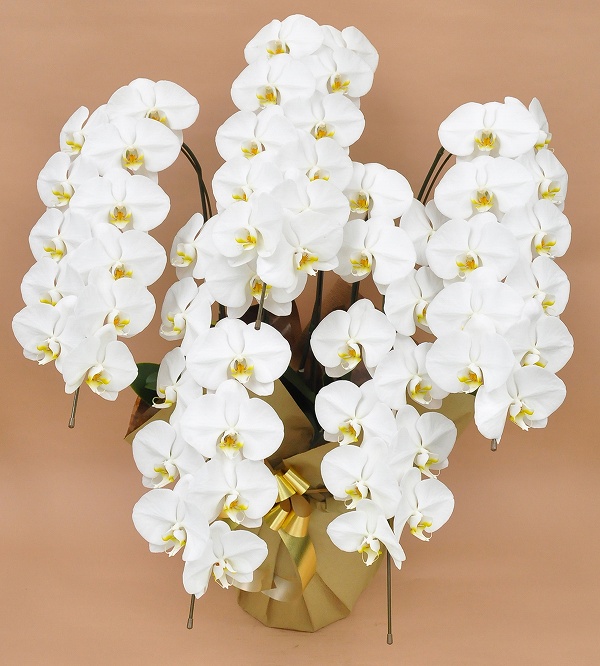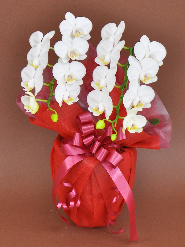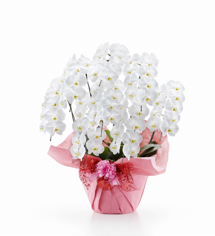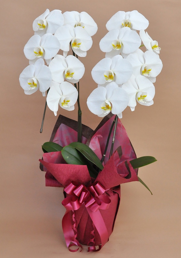 胡蝶蘭 プランB 白大輪2本立ち20輪以上(つぼみ込み) 白大輪3本立ち18輪以上(つぼみ込み) 白大輪2本立ち20輪以上 ・高さ:約65~75㎝(鉢底から) ・幅:約35㎝ ・鉢サイス:約21㎝ ・1本あたりの花数:10輪以上(つぼみ込み) 白大輪3本立ち18輪以上 ・高さ:約55~75㎝(鉢底から) ・幅:約35㎝ ・鉢サイズ:約22.5㎝ ・1本あたりの花数:6輪以上(つぼみ込み)