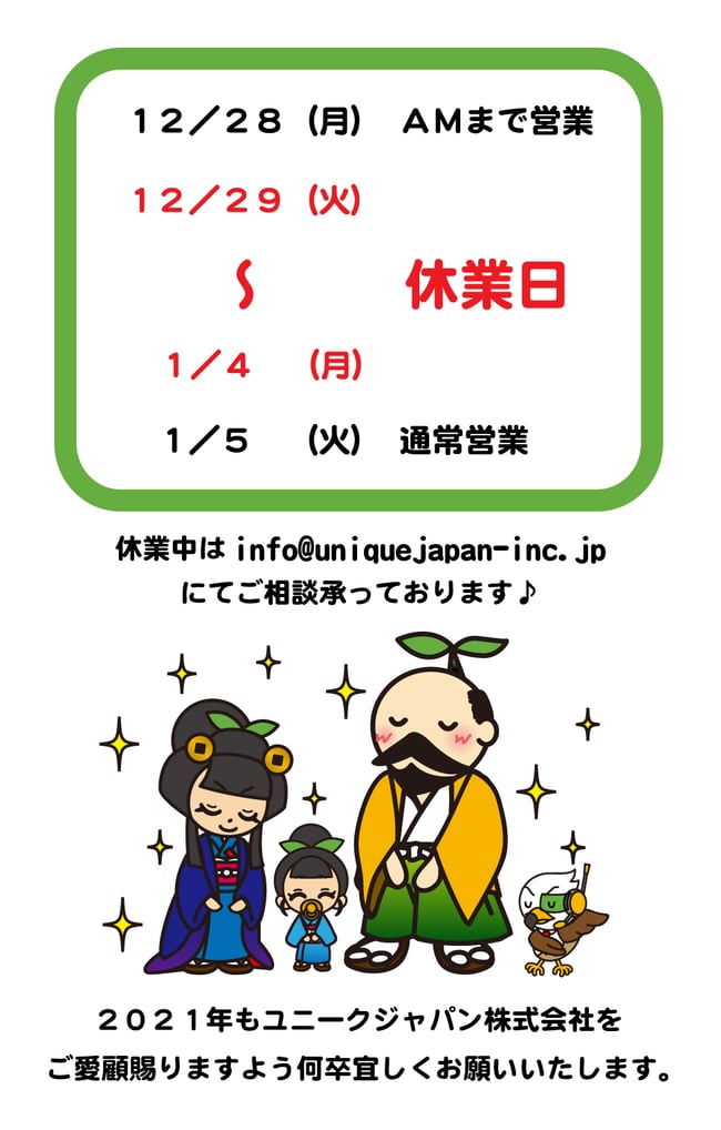 誠に勝手ながら、年末年始の営業を下記の通りご案内申し上げます。
